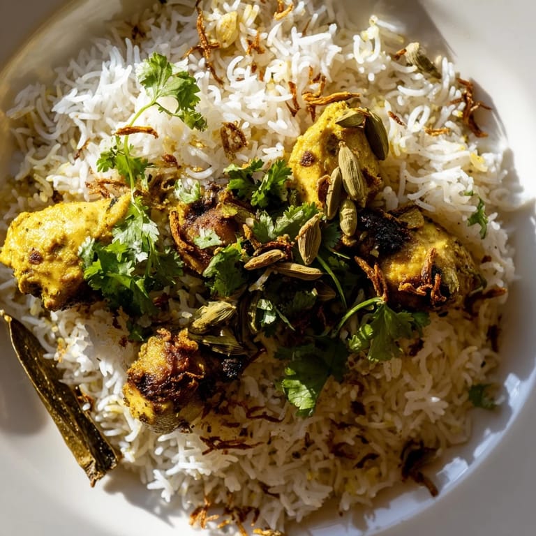 The whole spices aren't there for decoration; they're steeping in the water as the rice cooks, infusing every grain with subtle, sophisticated flavor. I used to think biryani needed hours of layering and resting, but this method proves that if you understand how spices work, you don't need all that fuss. The key is respecting the timing—letting the aromatics bloom, not rushing the chicken's cooking, and giving the rice space to absorb all those flavors.
