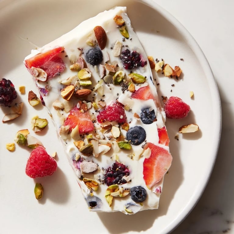 Pin It Last summer, my daughter came home from camp talking nonstop about the frozen yogurt bars they'd served at lunch. I tried recreating them from memory that weekend, spreading Greek yogurt on a sheet pan like I was frosting a cake, only to realize halfway through that I'd made it way too thick. The next attempt, thinner and scattered with berries, became her favorite grab-and-go breakfast. Now she makes it herself, choosing her own berry combinations and sneaking extra granola when she thinks I'm not looking.